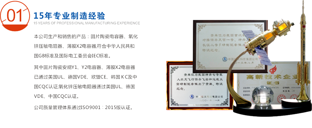本公司生產(chǎn)和銷(xiāo)售的產(chǎn)品:圓片陶瓷電容器、氧化鋅壓敏電阻器、薄膜X2電容器,符合中華人民共和國(guó)GB標(biāo)準(zhǔn)及國(guó)際電工委員會(huì)IEC標(biāo)準(zhǔn)。其中圓片陶瓷安規(guī)Y1、Y2電容器、薄膜X2電容器已通過(guò)美國(guó)UL、德國(guó)VDE、歐盟CE、韓國(guó)KC及中國(guó)CQC認(rèn)證;氧化鋅壓敏電阻器通過(guò)美國(guó)UL、德國(guó)VDE、中國(guó)CQC認(rèn)證。公司質(zhì)量管理體系通過(guò)ISO9001:2015版認(rèn)證。